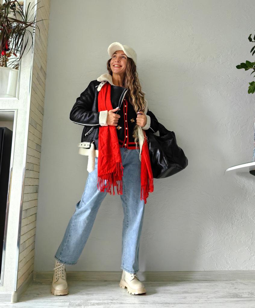 Bunda vyrobená z PU a viskózy je odolná a lze ji instalovat v různých kombinacích. Co takhle pletené šaty s rolákem, punčocháče a kozačky?