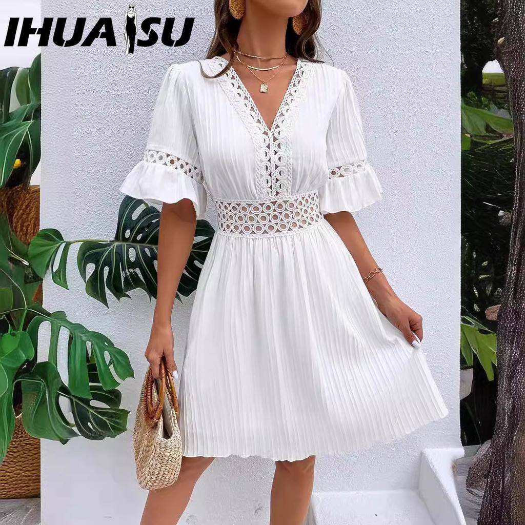 IHUASU Dámské letní patchworkové krajkové módní jednobarevné šaty s výstřihem do V