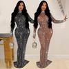 Cross-Border Fashion Sequin Bodycon Dress with Round Neck, Slit, Tassel Sleeves, and Ruched Design