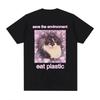 Save The Environment Eat Plastic Cute Cat Graphic T Shirt Funny Men Women O-Neck Clothing T-shirts Cotton T-shirt