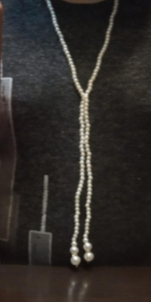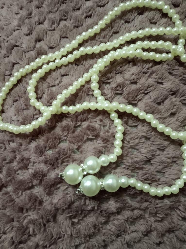 Tükk valget kaelakeed. Vastab kirjeldusele. Bijoux, kuid armas, sarnane pärlitega, ainult heledam kui tõeline pärl. Esmapilgul pole see erinev.