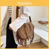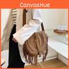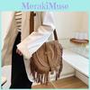 This vintage-inspired shoulder bag features a soft PU leather construction with a vertical rectangular shape and a large size suitable for daily use. It measures approximately 10 inches in height, 8 inches in width, and 3 inches deep, supporting essentials like smartphones and small accessories. The bag is accented with bohemian tassels and a secure zipper closure.