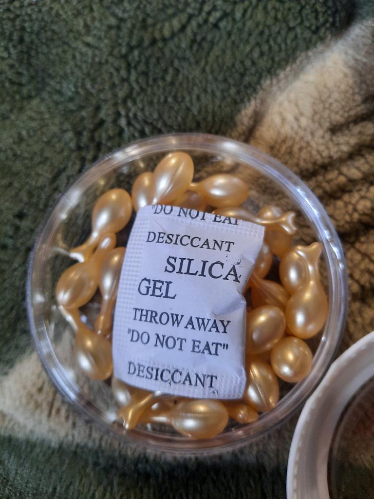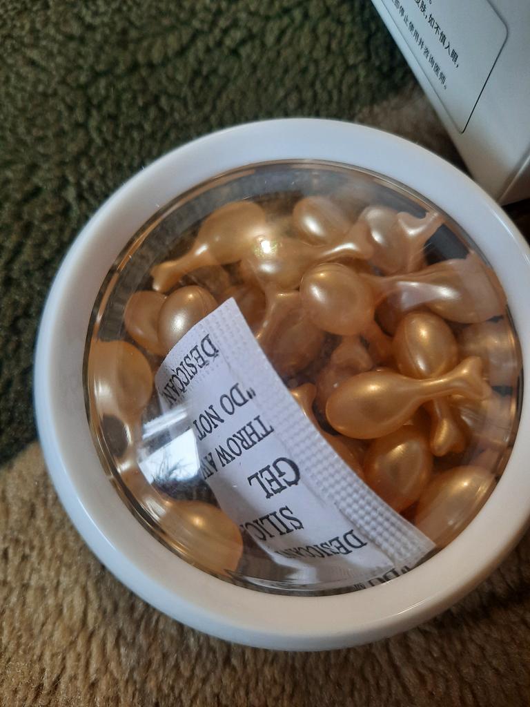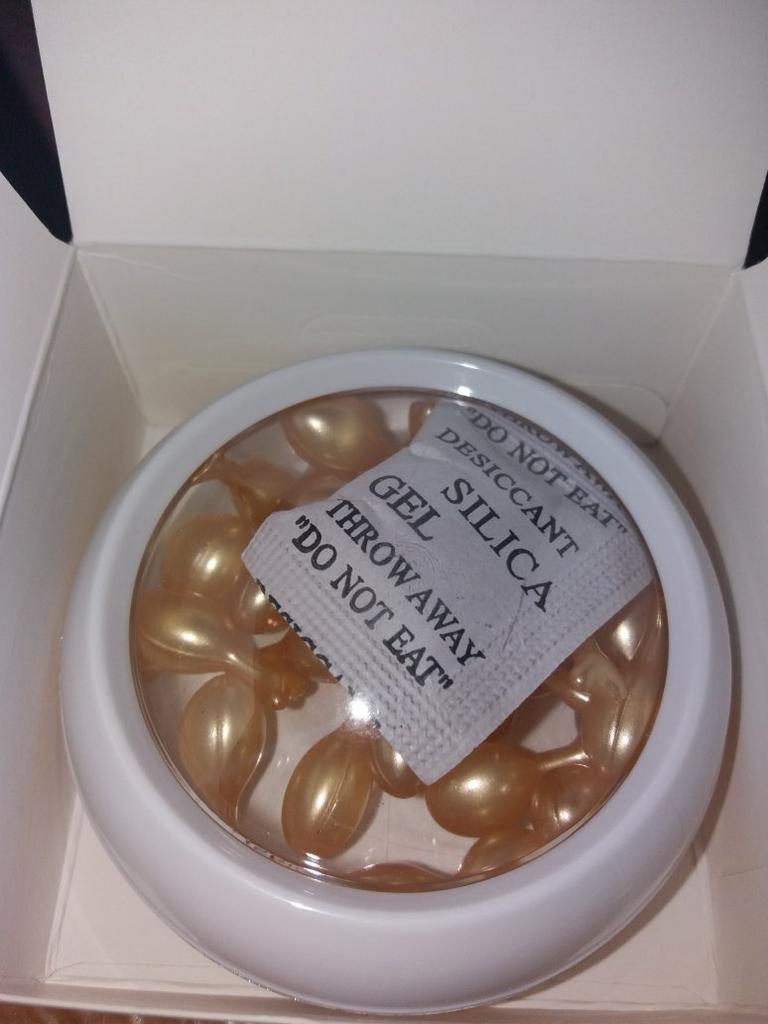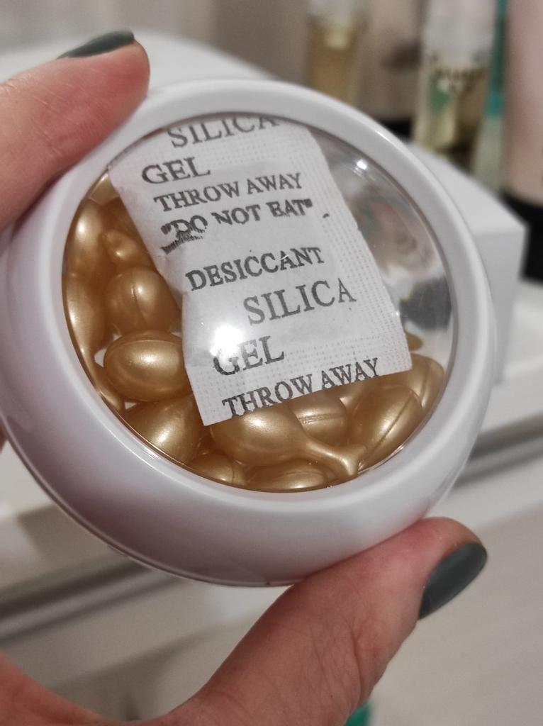 30 капсул увлажняющей сыворотки приехали в посылке вместе с другими товарами. Красивая коробочка, но не понятно, что там написано, т.к. все надписи на китайском языке. Сама коробочка запаяна (хоть и не полностью) в пленку. А вот содержимое баночки сверху запаяно пленкой не было, что меня удивило. Я уже лет 7 покупаю продукцию, похожую на эту. Но больше всего меня поразила упаковка, устраняющая запах, которые обычно кдадут в сумки или коробку с обувью. Содержимое одной капсулы выдавила на руку. Да, действительно, масляная жидкость, но на лицо накладывать остерегаюсь