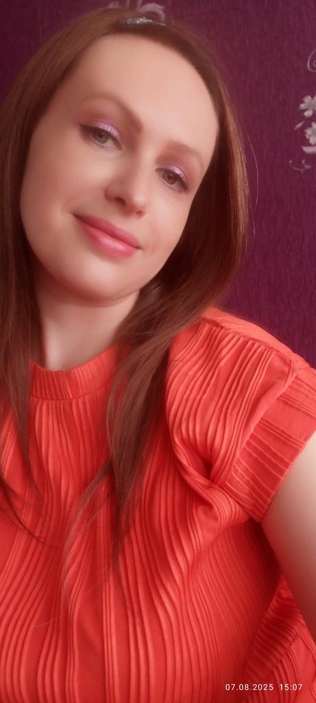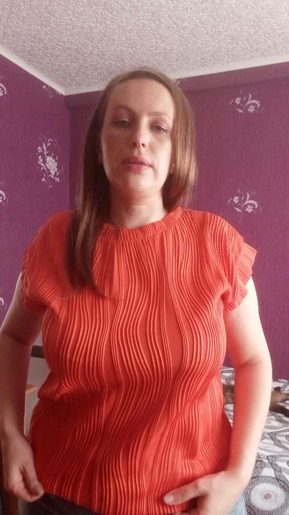 До этого заказывала футболку в размере XL в бежевом оттенке, на мой ОГ 105 была большой. Можете у меня на страничке посмотреть отзыв про неё. Поэтому рискнула в этот раз заказать размер L в оранжевом оттенке, немного маловат а в груди, зато по талии лучше села. У нее из-за нестандартных рукавов образуются складки, а так крой у неё свободный. В принципе не критично, села даже лучше чем предыдущая. Продавца и футболку рекомендую.
